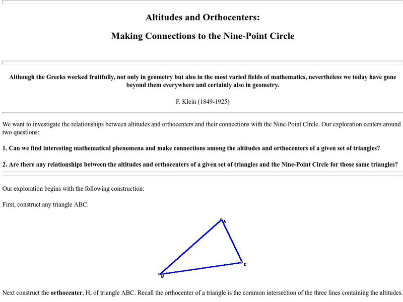 This site describes altitudes and orthocenters in triangles and their connections with the nine-point circle.