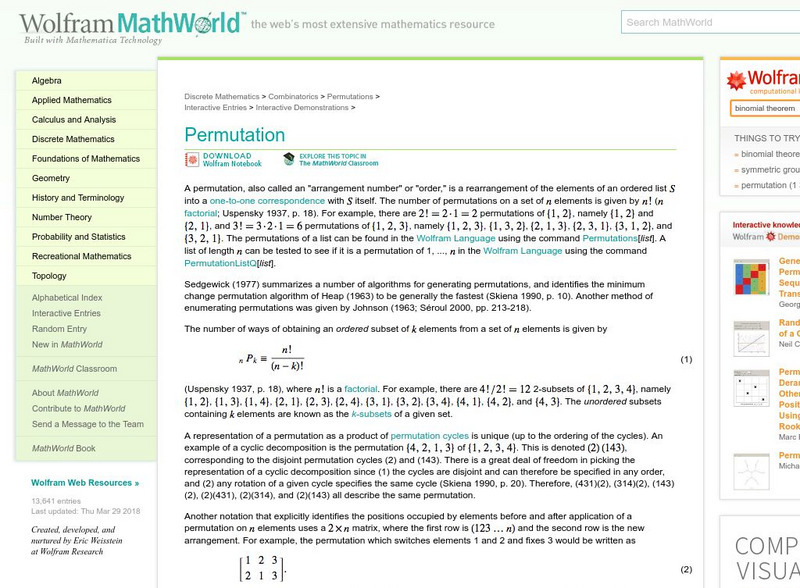 This MathWorld page gives information about permutations. Its real merit lies in the fact that there are examples for a clear understanding at various parts of the site and many links to learn detailed information about various aspects...