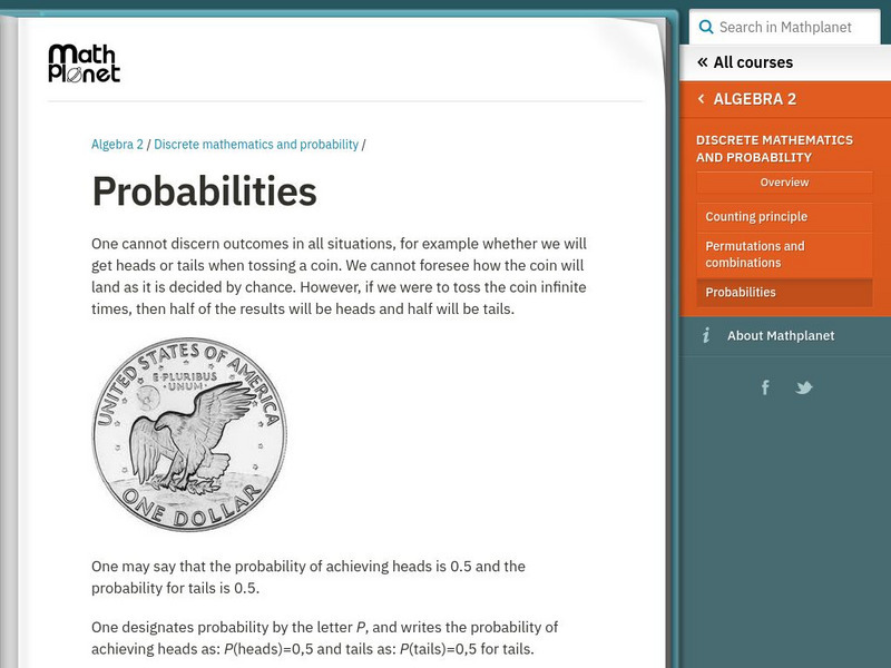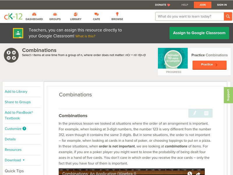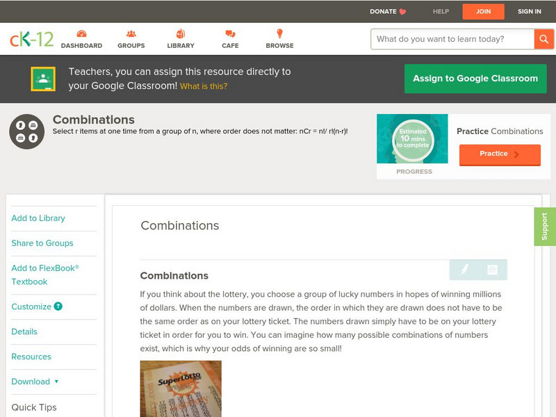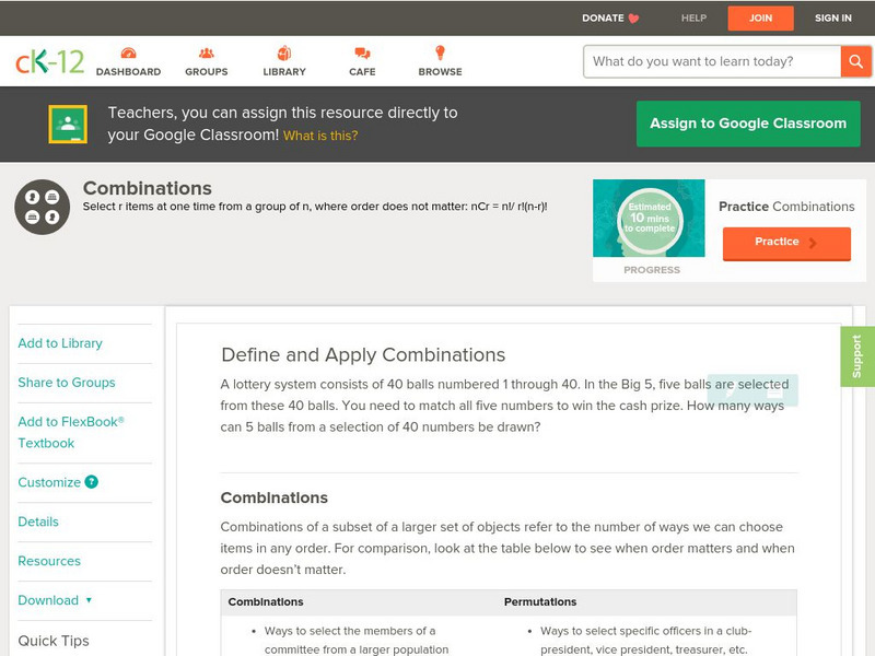 [Free Registration/Login may be required to access all resource tools.] This lesson covers how to define and calculate combinations of objects and recognize the difference between a combination and a permutation.
