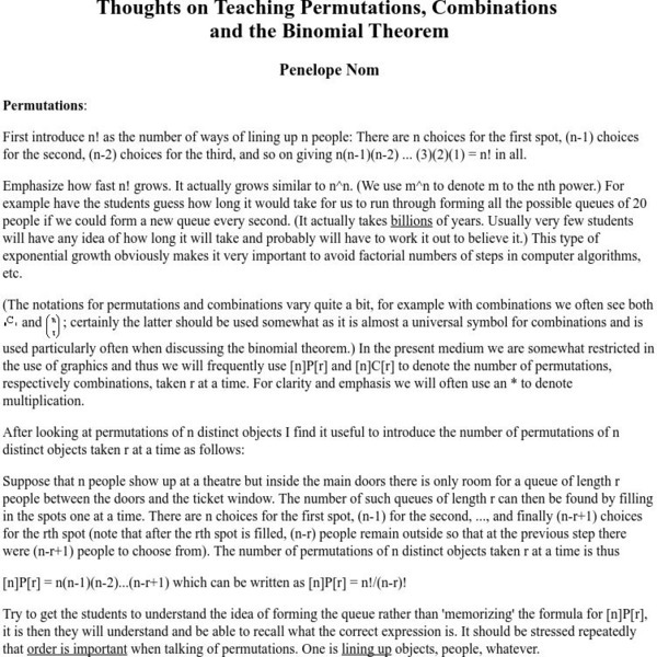 University of Regina: Math Central: Thoughts on Teaching Perm. And Combin.