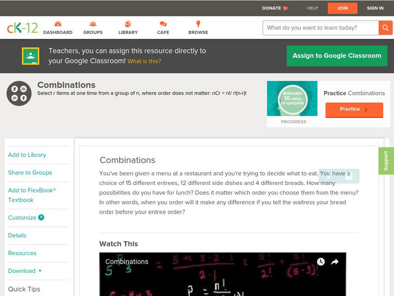 [Free Registration/Login may be required to access all resource tools.] This Concept introduces students to the basics of permutations and combinations.