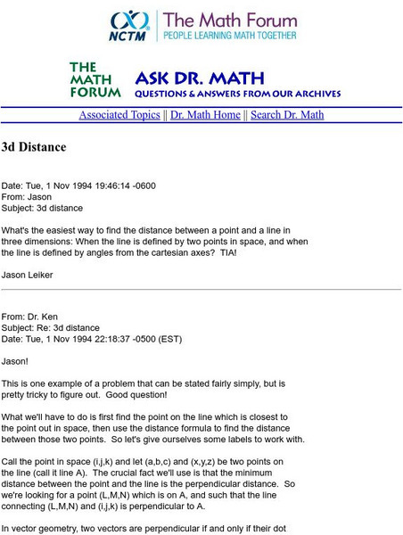 "Ask Dr. Math" is posed with a question of finding the distance between a point and line in space. Read about the solution.