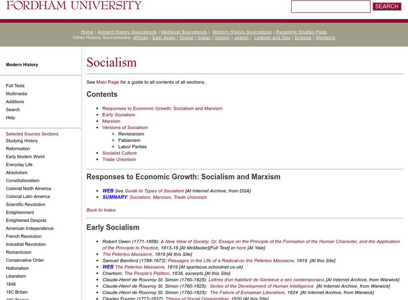 Links to a wide variety of socialism resources. Selections marked "at this site" are parts of the Internet Modern History Sourcebook, and all others are outside resources.