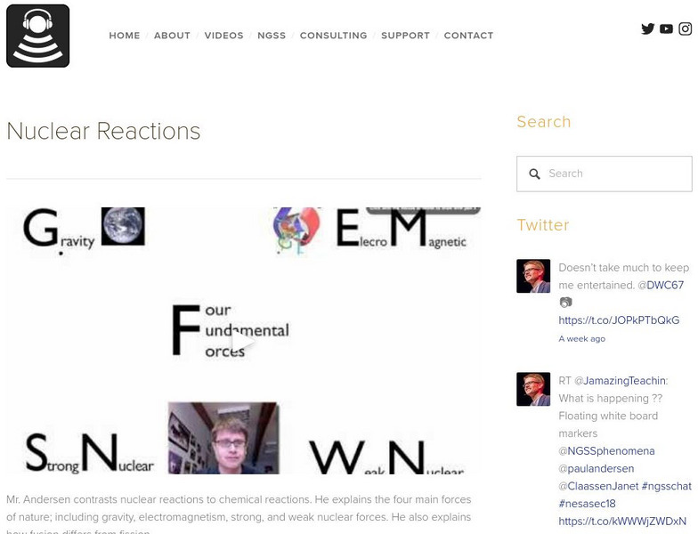 Mr. Andersen contrasts nuclear reactions to chemical reactions. He explains the four main forces of nature; including gravity, electromagnetism, strong, and weak nuclear forces. He also explains how fusion differs from fission.