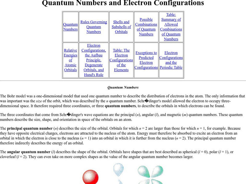 This site from the Purdue University provides quantum numbers explained in detail and shown how they specify the atomic orbital of each electron and their energy levels. Electronic configurations are explained. Learning exercises with...