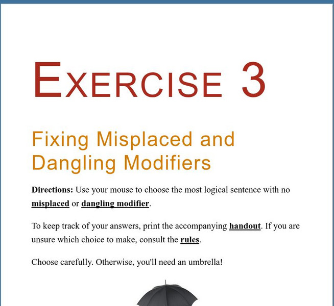 This is a 10-question, self-grading exercise/quiz on correcting Dangling Modifiers.