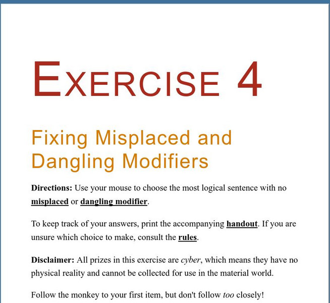 Practice grammar skills in this online interactive worksheet. Middle schoolers answer ten multiple choice questions regarding dangling and misplaced modifiers. They may submit their answers to be scored.