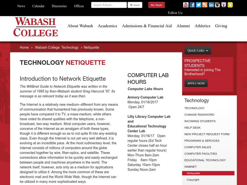This site from Wabash College gives rules not only for internet etiquette, but more specifically for etiquette concerning networks. This site is particularly relevant to college students.