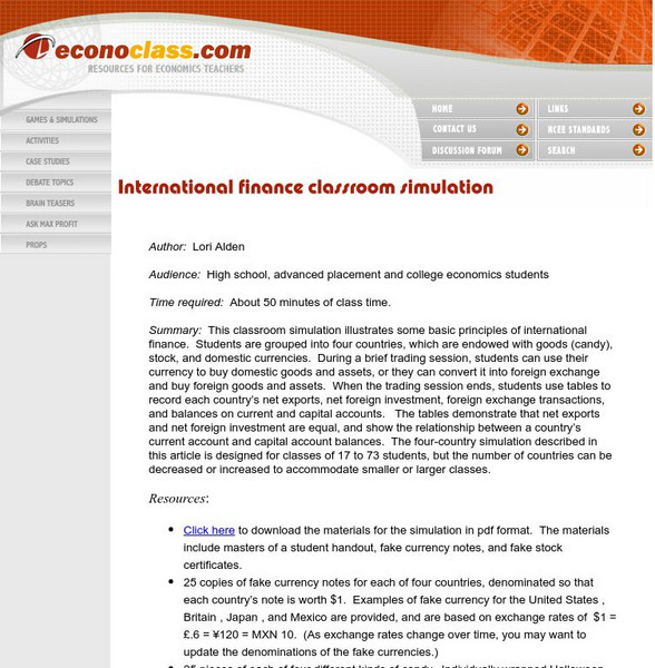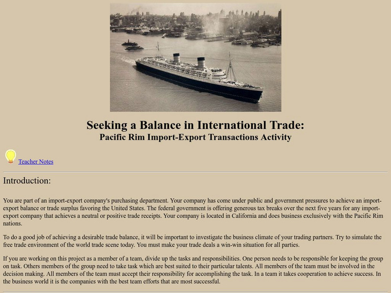Students work to solve problems involving international trade, then seek to improve the balance of trade with other countries. At this site, you can develop and make decisions similar to those in international business. Includes links to...