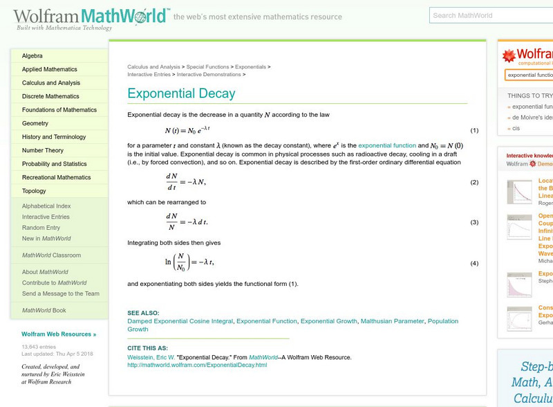 MathWorld provides the equation for exponential decay and an explanation of the variables of the equation.