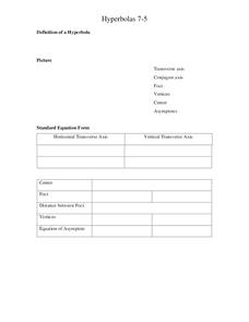 For this hyperbolas worksheet, 11th graders solve and complete 5 different problems. First, they define hyperbolas and draw a picture of one. Then, students find the coordinates of the vertices and the foci and the equation for the...