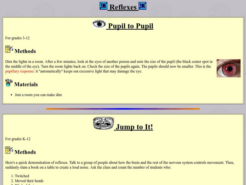 Site provides interactive activities to use in the classroom to test one's reflexes. Also includes more reaction time experiments as well as links to more fun activities.