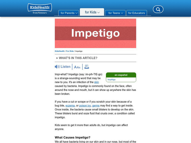 This site from KidsHealth.org answers the question of what is impetigo on a kids level. The information is easy to understand, and it contains links throughout for additional information. Also includes facts on "How do I know if I have...