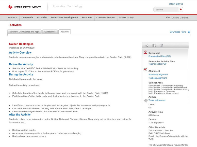 In this activity, students measure rectangles and calculate ratio between the sides. They compare the ratio to the Golden Ratio.