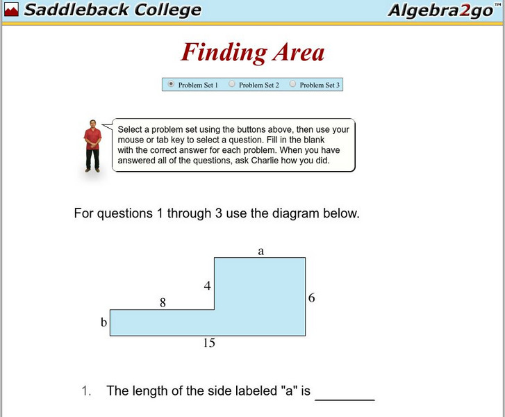 This resource has three sets of problems. Each set has six questions for finding area of irregular shapes formed by line segments. Select a problem set, then select a question. Fill in the blank with the correct answer for each problem....