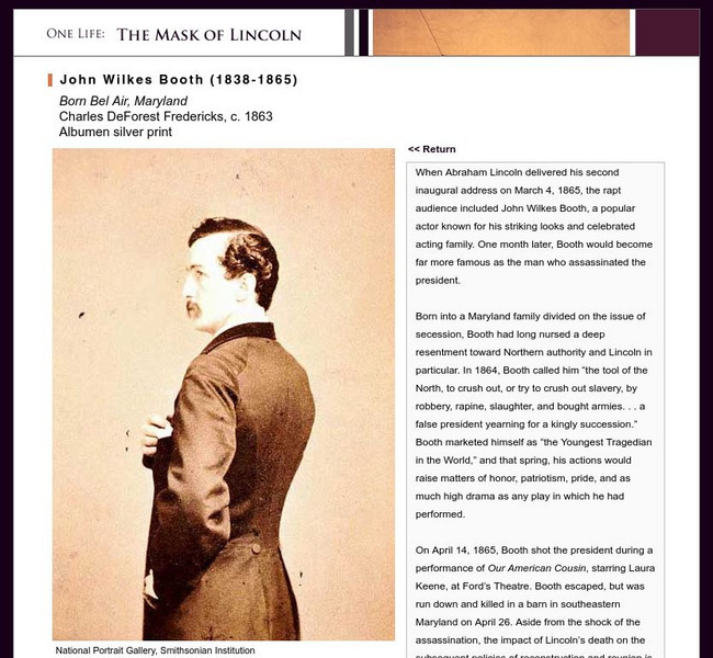 The National Portrait Gallery publishes a captioned portrait of John Wilkes Booth in which Booth's animosity toward Lincoln and the events of Lincoln's assassination are recounted.