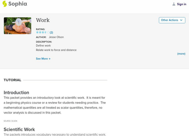 This resource gives the definition of work and explains how work is related to force and distance. Also explains the units used to measure work and how it is calculated.