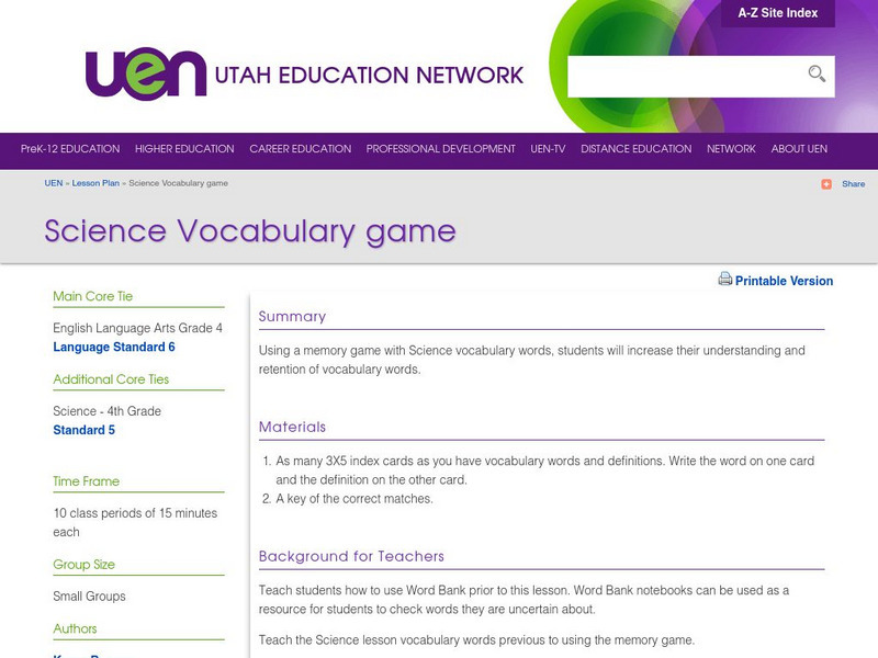Fourth graders will play a review memory game with Utah's Grade 4 Science Standard V vocabulary words during this lesson plan. Words associated with living things and classifications of living things are included in this lesson plan.