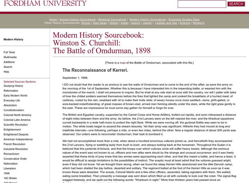 Fordham University gives Winston Churchhill's account of the Battle of Omdurman. (He fought in the battle as a young soldier in the cavalry.)