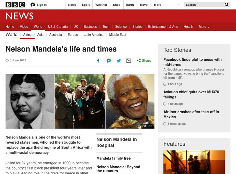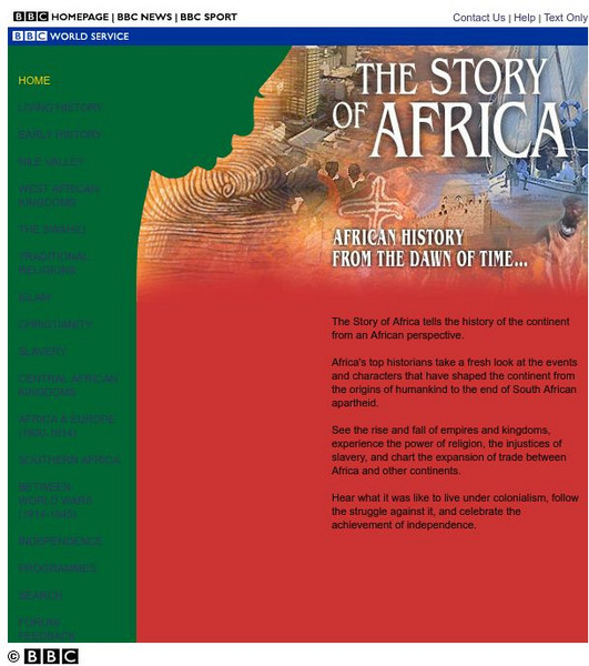 The history of Africa is documented from earliest times to the present. The menu bar divides it into time periods which then divide into sub-topics; also included is a visual timeline.