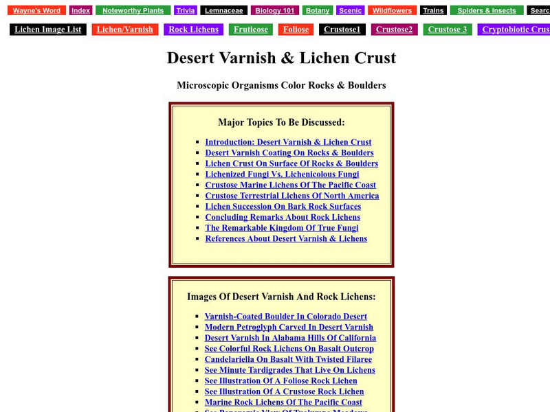 Lichens thrive in common and in very specialized and inhospitable climates. This clickable index site offers text and photographs of desert and mountain lichens.