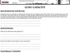 For this lung capacity worksheet, students use straws, funneling, liquids, tubing, and more to test their lung capacity. Students follow 14 sets of directions and analyze their data.