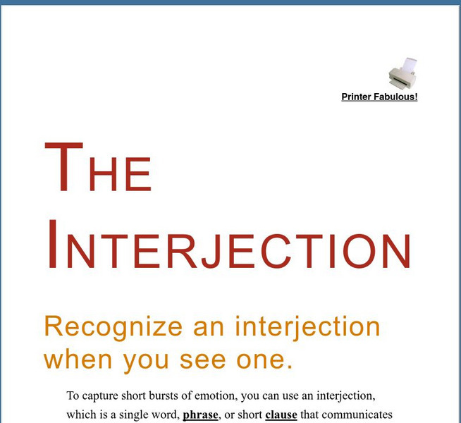 A resourceful and professional look at interjections. Provides definitions, examples, and additional information. A great site from the Writing Center at the University of Illinois.