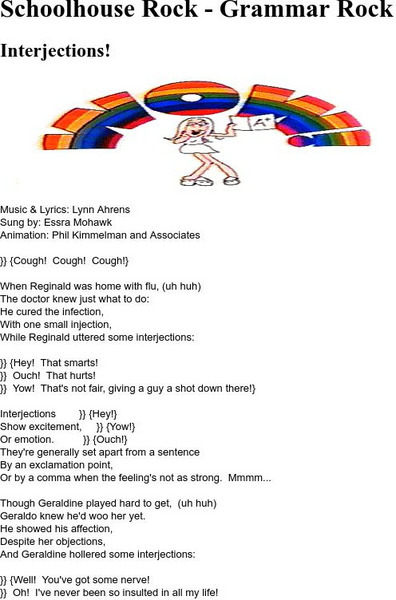 This site from Schoolhouse Rock provides the lyrics for the grammar rock song about interjections. This old song will help you remember what interjections are and how they work. It is taken from the old cartoon series, Schoolhouse Rock.