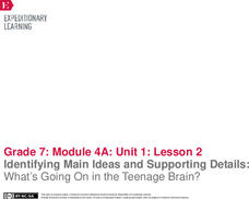 Scholars view a video clip about adolescent brain development and work with partners to identify the main idea and supporting details. Next, as part of the mid-unit assessment, pupils watch another clip from the video and complete a main...
