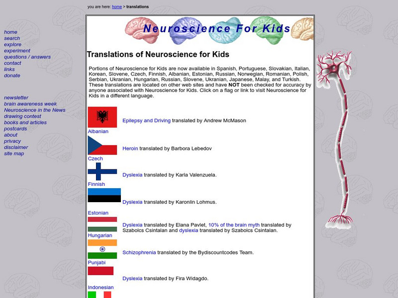 Translations of Neuroscience for Kids, an excellent site on the brain and brain science by neuroscientists at the University of Washington. Includes Chinese (Mandarin and Cantonese), Portuguese, Italian, Slovene, and Korean. Translations...