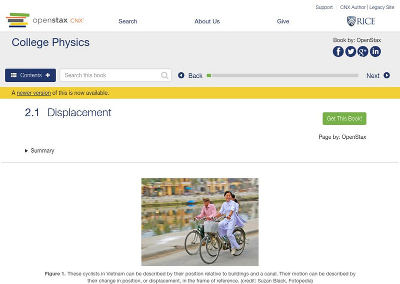 A six-lesson e-textbook covering topics in one dimension kinematics. Lessons include informational text, interactive activities, and quick, interactive comprehension checks along the way.