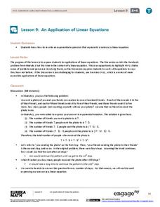 Learners solve vacation equations using tape in a lesson plan that utilizes tape diagrams to aid in understanding the algebraic steps involved in solving two-step linear equations. Groups work together to solve seven scenarios involving...