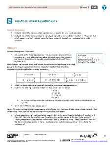 What does it mean to solve an equation? The resource revisits the concept of making a linear equation true. Classmates use algebraic methods to transform sides of equations to expressions with fewer terms. They use substitution to...