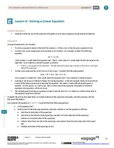 Collaboration is the key for this equation-solving lesson. Learners solve a multi-step linear equation that requires using the distributive property. Within collaborative groups, scholars discuss multiple methods and troubleshoot mistakes.