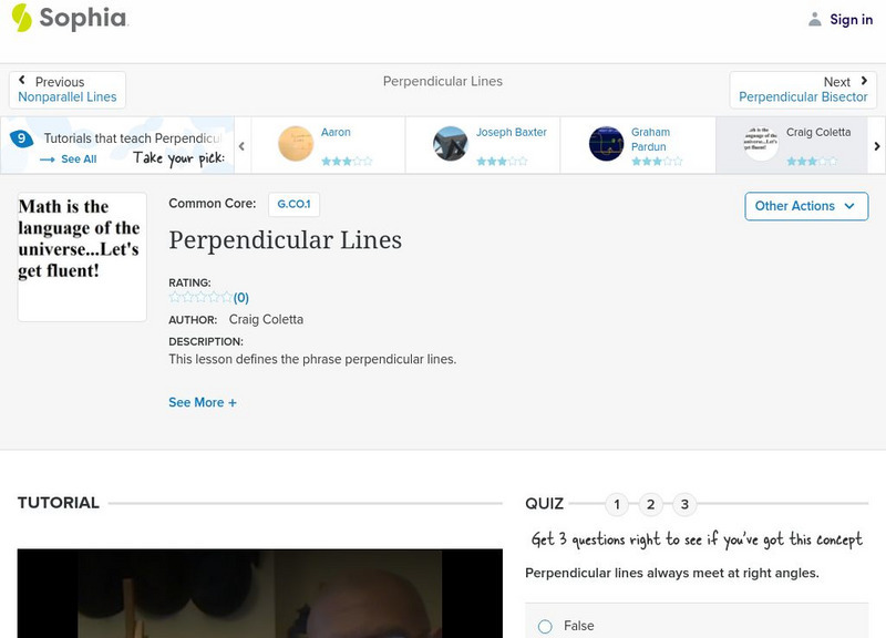 In this video tutorial [2:10], perpendicular lines are defined and explained in this lesson. Take a quiz to assess learning.