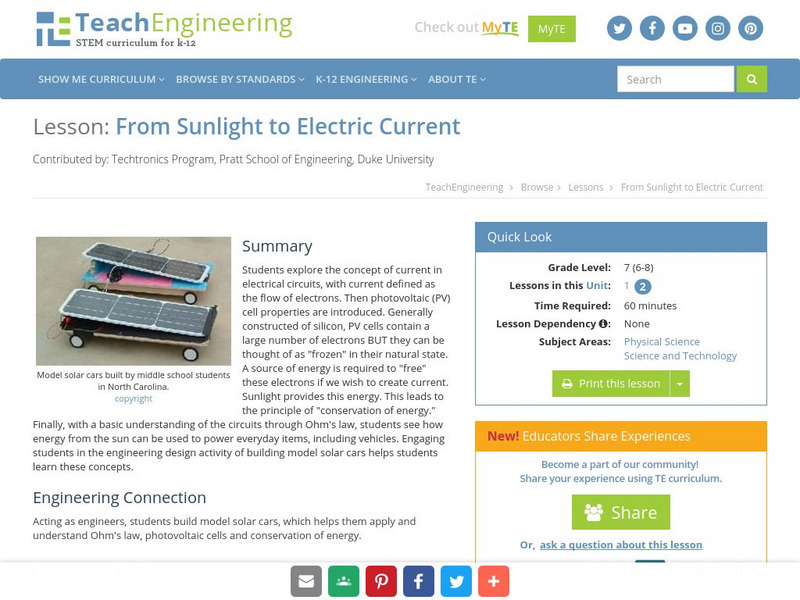 The lesson will first explore the concept of current in electrical circuits. Current will be defined as the flow of electrons. Photovoltaic (PV) cell properties will then be introduced. This will lead to the principle of "Conservation of...