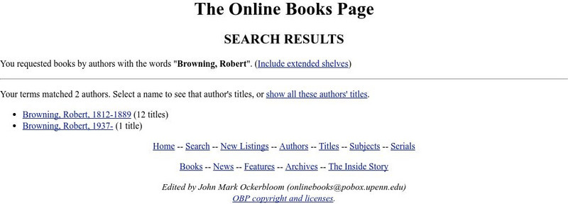This site provides links to five of Robert Browning's most famous works including "Dramatic Lyrics," "Dramatic Romances," "An Introduction to the Study of Robert Browning's Poetry," "The Pied Piper of Hamelin," and "The Ring and the Book."