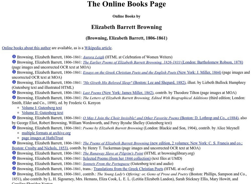 This site provides links to five of Browning's most famous works including "Aurora Leigh," "The Runaway Slave at Pilgrim's Point," "Selected Poems," "Sonnets From the Portuguese," and "Translations from the Greek Christian Poets."