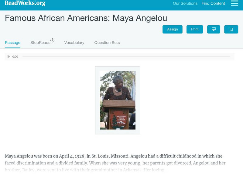 [Free Registration/Login Required] This passage contains biographical information about the famous author and civil rights leader and activist named Maya Angelou. This passage is a stand-alone curricular piece that reinforces essential...