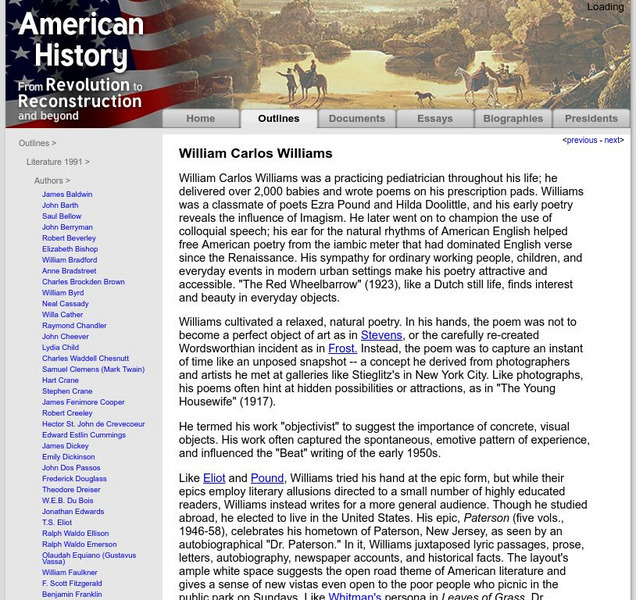 Part of a series on "Modernism and Experimentation: 1914-1945," this aticle features a biographical note and appraisal and an excerpt from Williams's poem, "Paterson."
