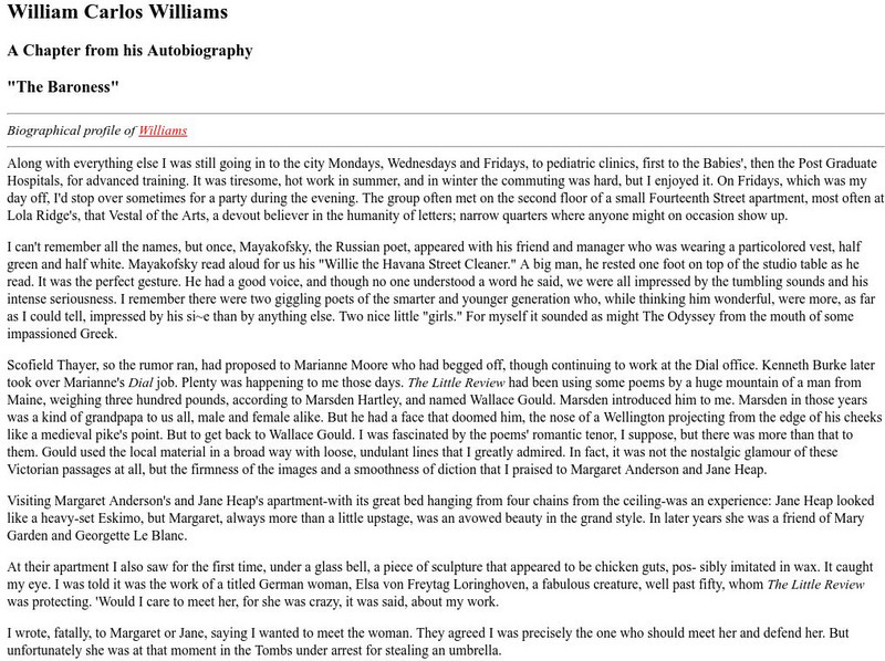 Full text of a chapter from William Carlos Williams's autobiography, "The Baroness," which provides a personal view poetry and culture after World War I.