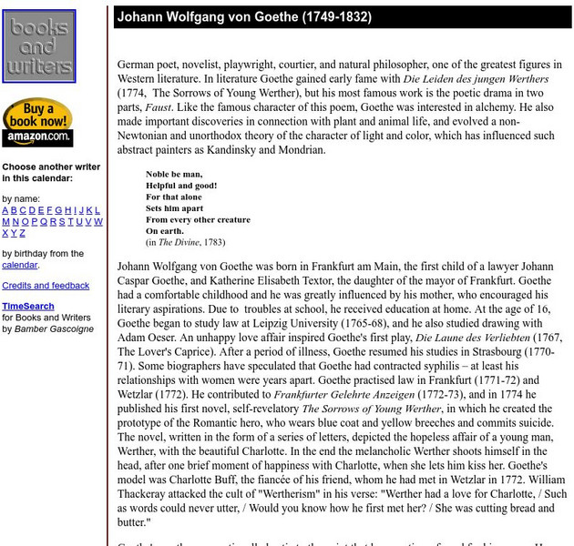 This site offers a biography of Goethe, a brief discussion of his most famous work, "Faust," and a list of the many versions of this work. Also includes a bibliography.