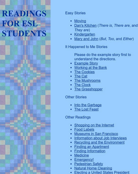 This site offers a list of links to leveled, adapted readings for the English language learner. It provides self-scoring comprehension questions to accompany each story.