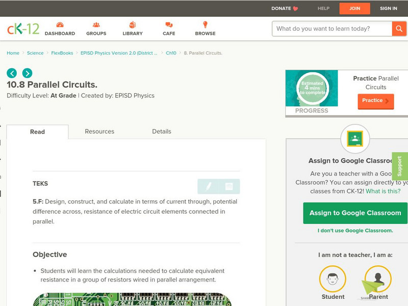 [Free Registration/Login may be required to access all resource tools.] In this lesson, students learn about parallel circuit design, and how to calculate equivalent resistance from resistors in a parallel circuit.