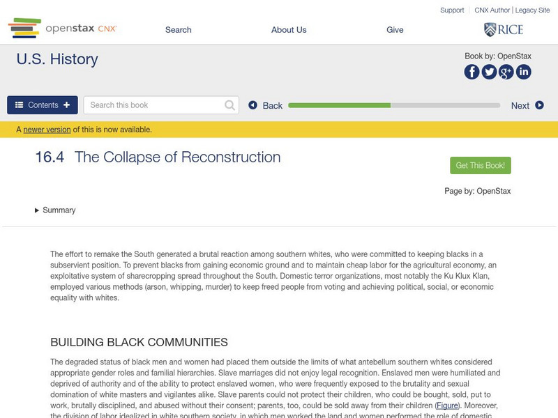 This section from a chapter on "The Era of Reconstruction" explains the reasons for the collapse of Reconstruction and describes the efforts of white southern "redeemers" to roll back the gains of Reconstruction.