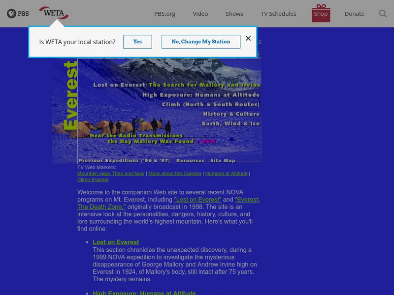 The companion web site to NOVA programs on Mt. Everest: Lost on Everest, High Exposure: Humans at Altitude, Climb, History and Culture, Earth, Wind, and ice, Previous Expeditions, and Resources.