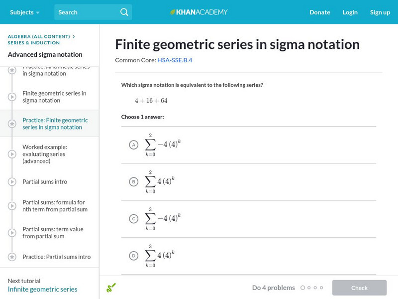 Practice writing finite geometric series like 3 + 6 + 12 + 24 in sigma notation. Students receive immediate feedback and have the opportunity to try questions repeatedly, watch a video or receive hints.