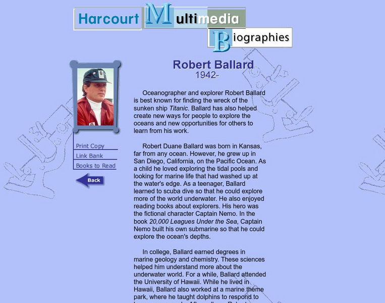 Although best known for finding the wreck of the Titanic, Robert Ballard has also explored oceans, developed submarines, and founded the JASON project. Here you can read about his exciting life. Also includes photos.