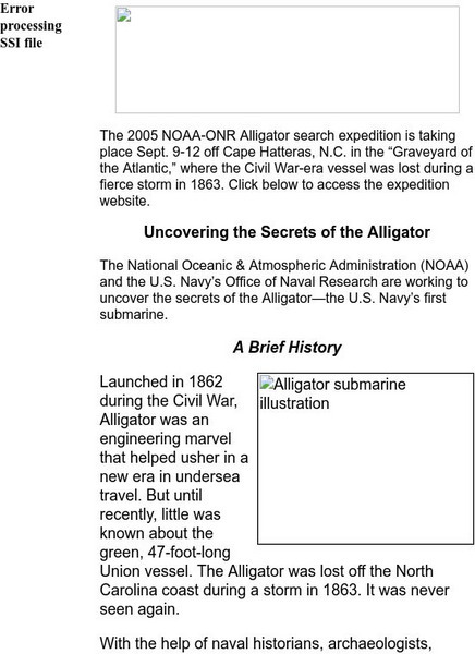 A website dedicated to the engineering marvel, USS Alligator. Read a history and find blueprints of this innovative submarine. Use the topics on the left to navigate the site. From the National Oceanic and Atmospheric Administration.