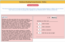 Test scholars' reading comprehension skills with interactive practice. Learners read a short informative text about rainbows, then answer eight multiple-choice questions. A report details their progress after the exercise is complete.